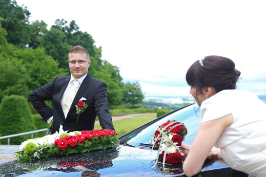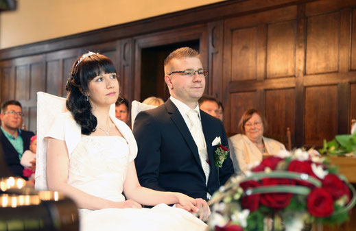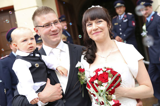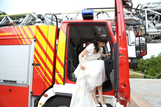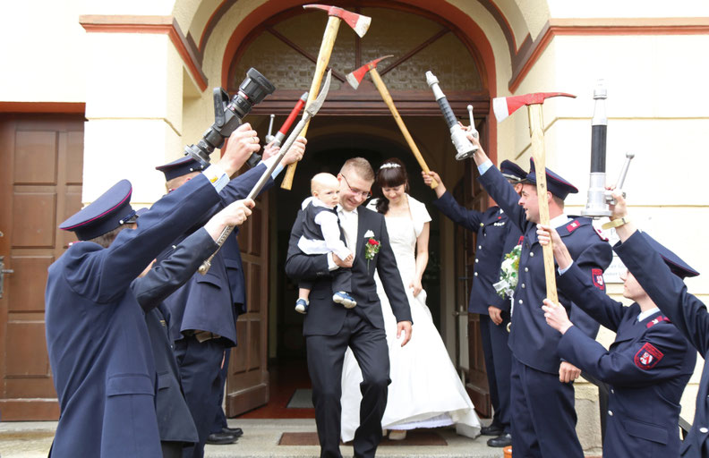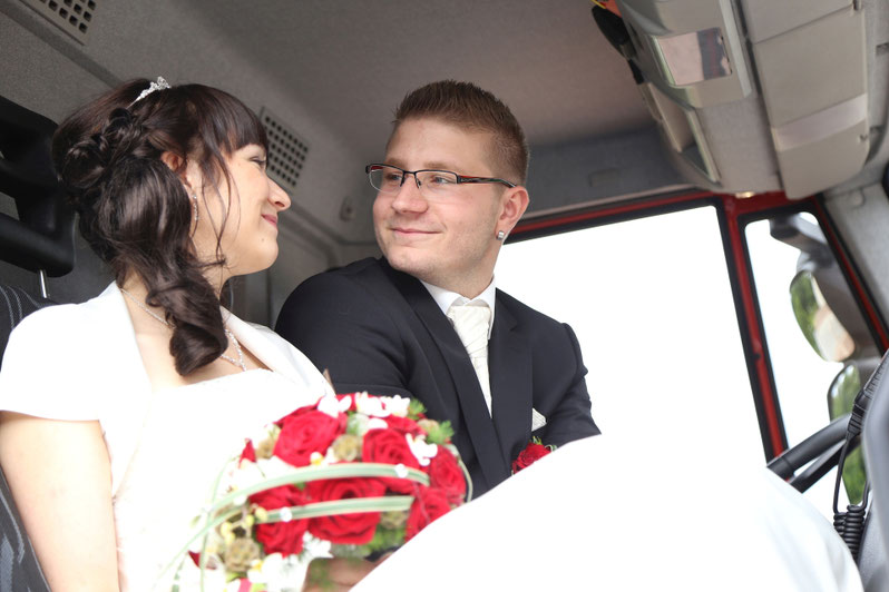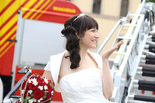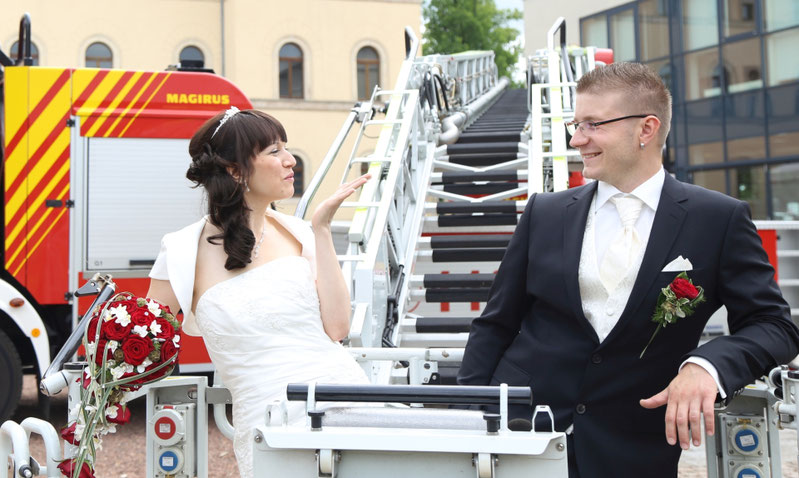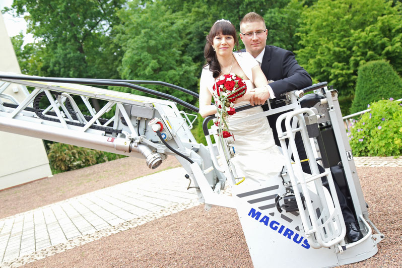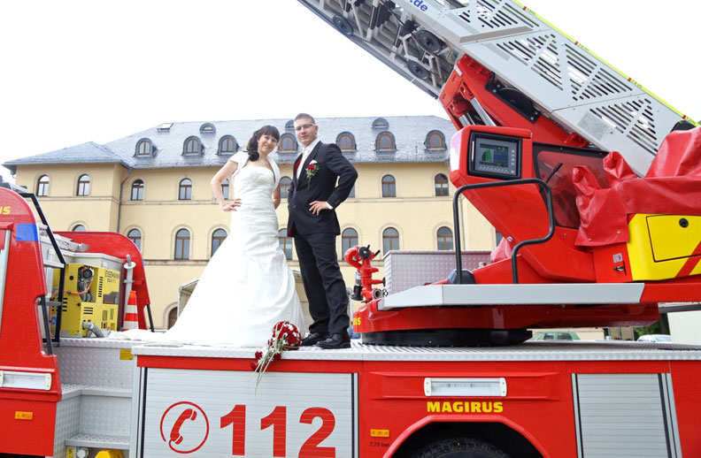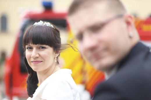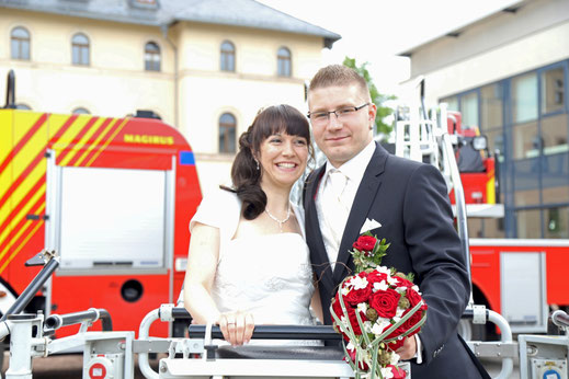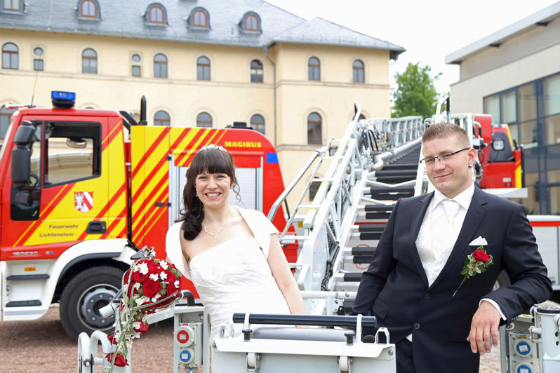 Ende Juni begab ich mich zur standesamtlichen Trauung in meine ehemalige Heimatstadt. Ich hatte schon die ganze Woche die Daumen für gutes bzw. wenigstens trockenen Wetter gedrückt. Es hätte durchaus ein Stückchen wärmer sein können, aber zumindest war es für`s Erste trocken...was in Anbetracht des letzten Wochenendes schon ein großer Fortschritt war ;) Nach der Trauung wurde das Brautpaar von der Feuerwehr in Empfang genommen, sodass wir zum anschließenden Brautpaarshooting auch direkt Feuerwehr und Drehleiter als requisiten nutzen durften. Sehr cool, hatte ich in der Form auch noch nie ;) Kaffee&Kuchen gab es später in der Käpplereiche in Lichtenstein.