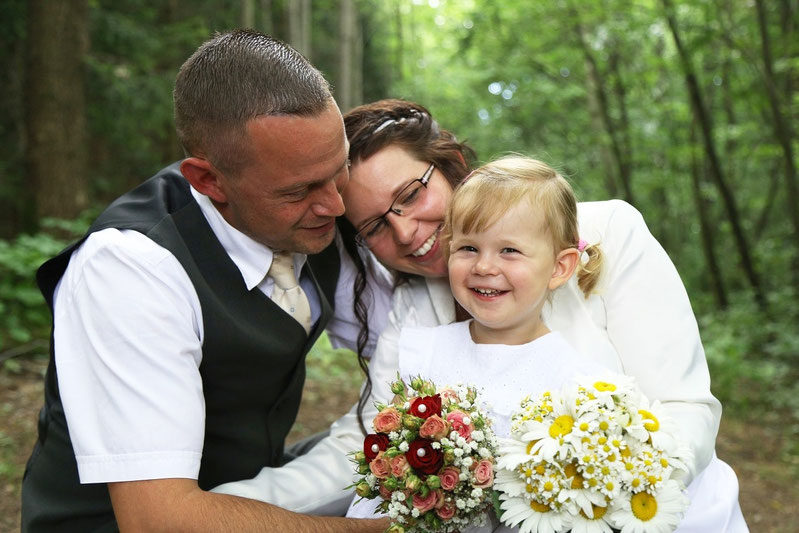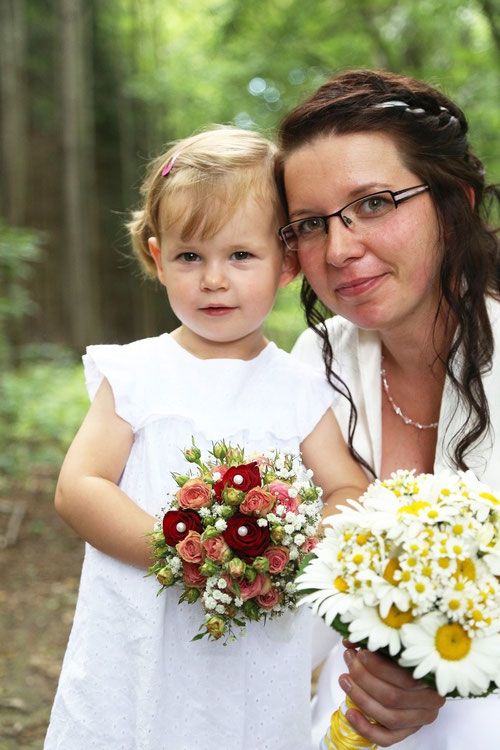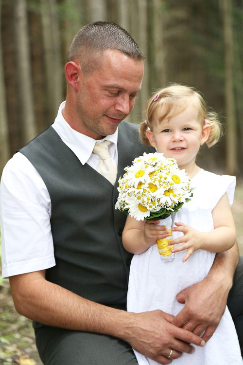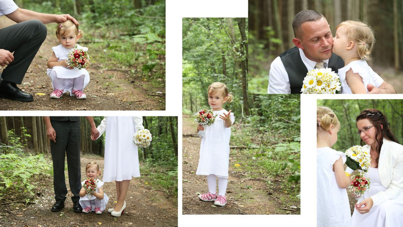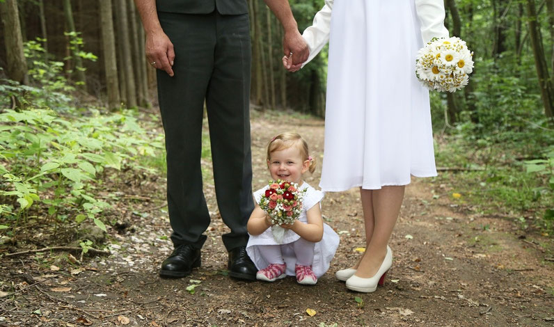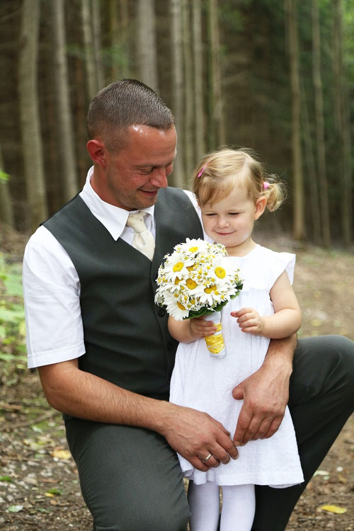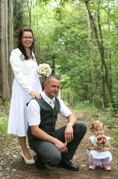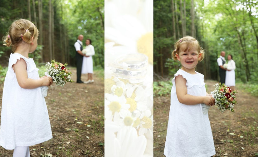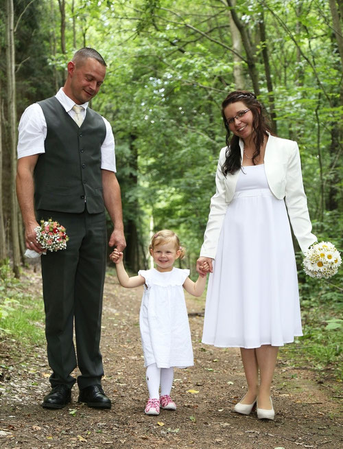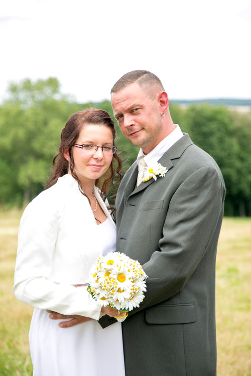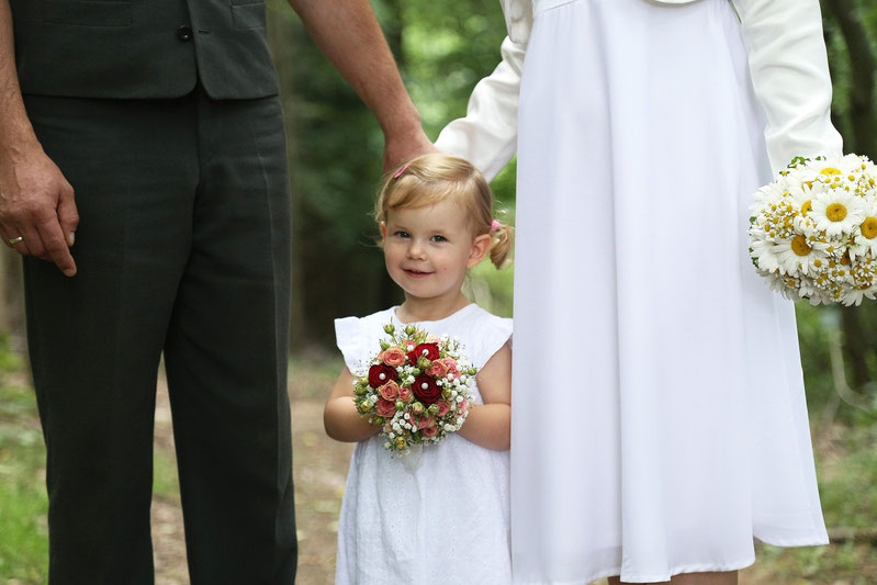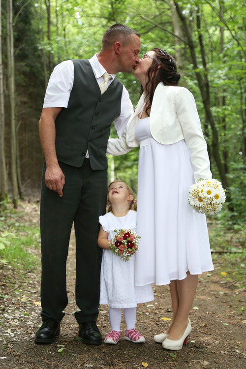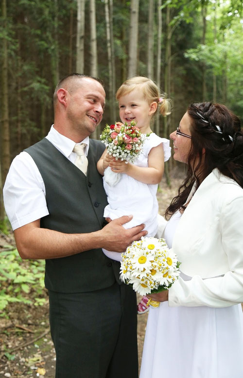 Am 14. Juli 2014 traf ich mich mit Ninette, Rico und der süßen kleinen Edda. Die drei hatten gerade eine Trauung im engsten Kreis der Familie hinter sich und waren nun für das kleine Brautpaarshooting bereit. Da die anschließende Feier im Forsthaus Glauchau (wunderschön am Wald gelegen) stattfand, nutzten wir dies natürlich direkt für unsere Fotos. Der Brautstrauß komplett aus weißen "großen" Gänseblümchen - sehr hübsch und mal was Anderes. Und sogar die kleine Edda hatte ihren eigenen Strauß - zuckersüß sag ich euch.