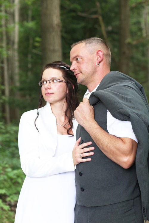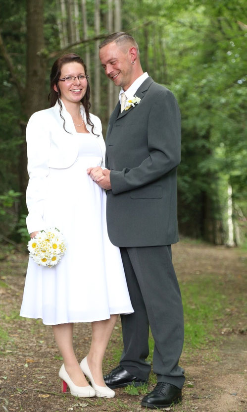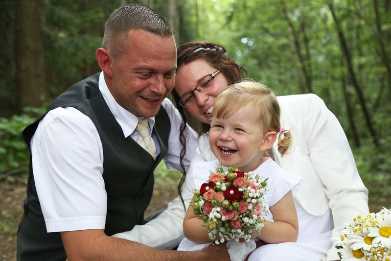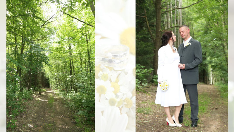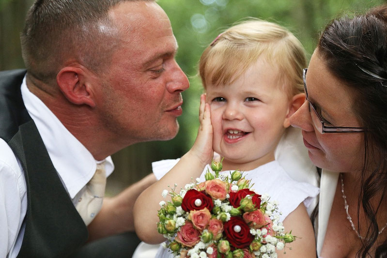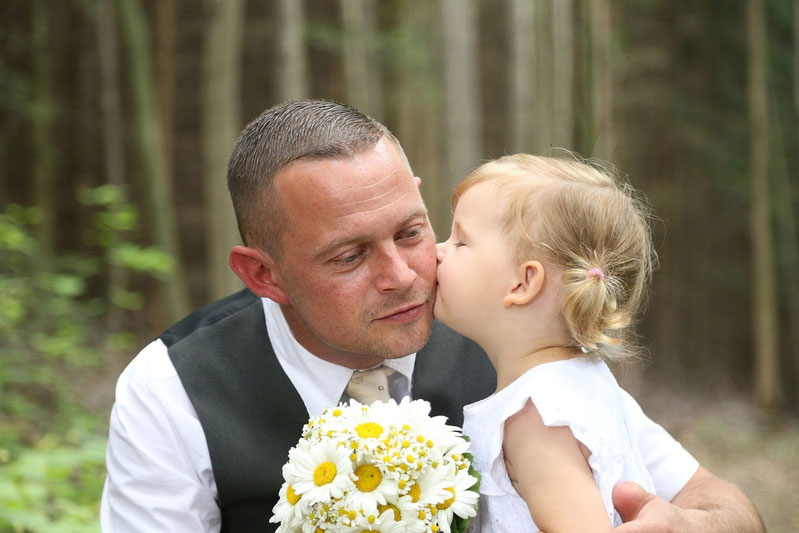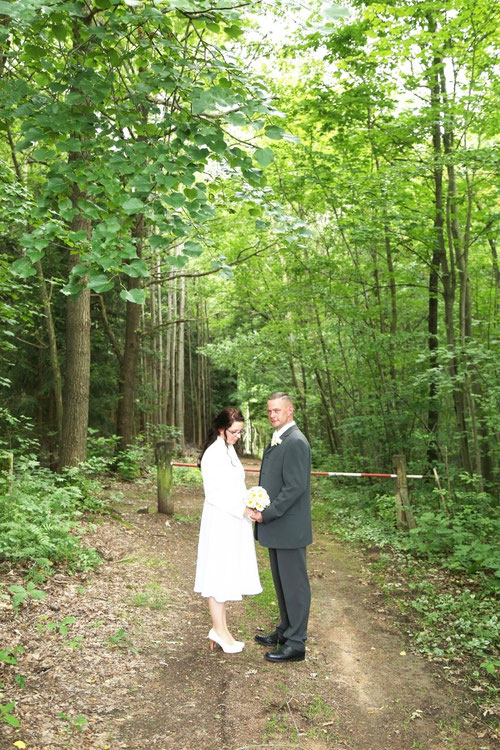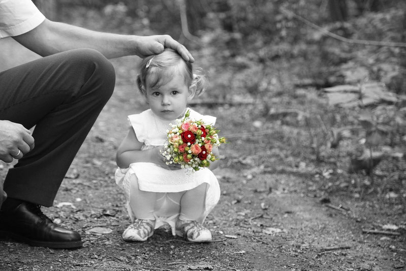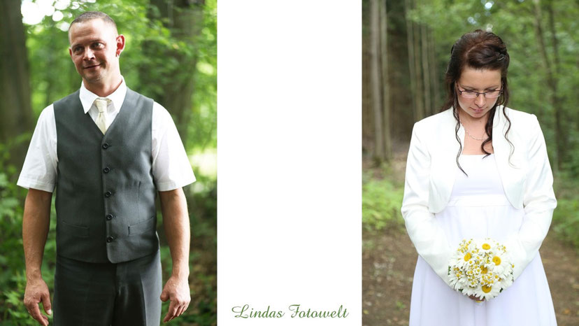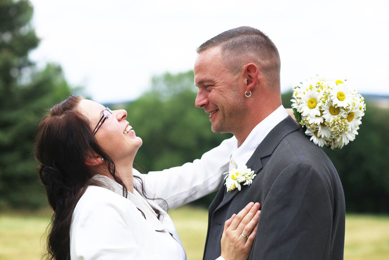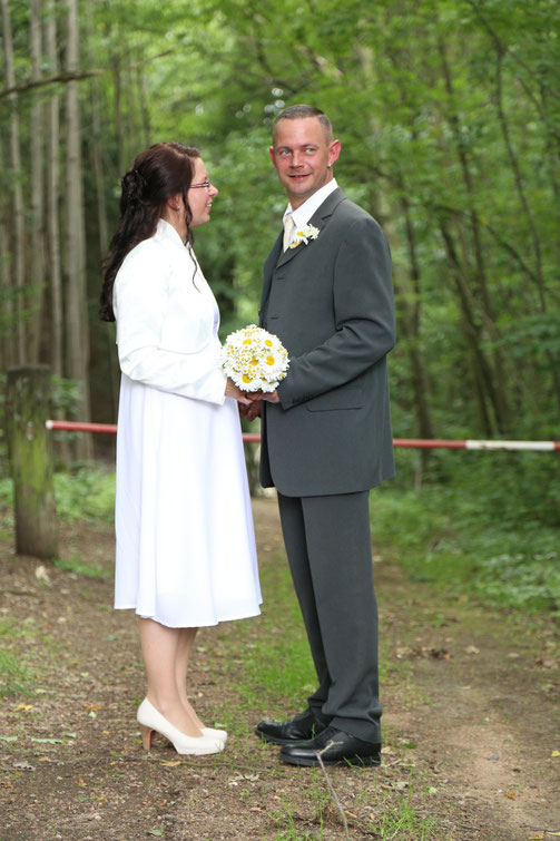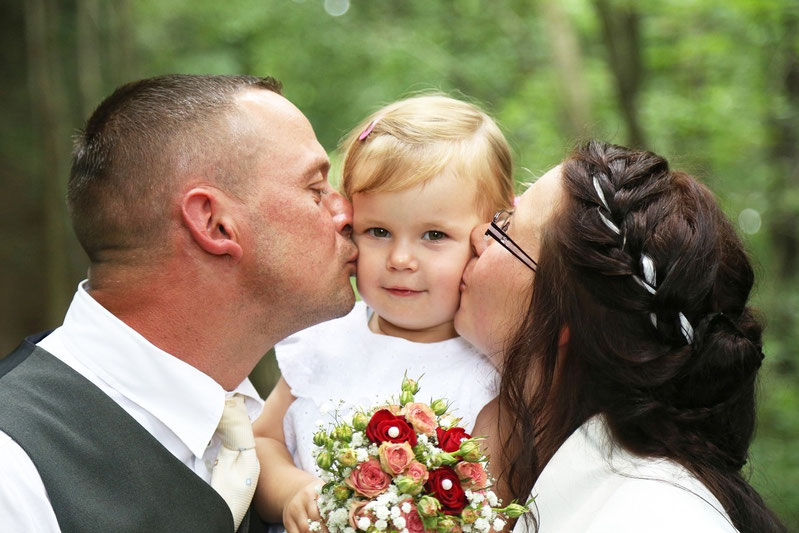 Am 14. Juli 2014 traf ich mich mit Ninette, Rico und der süßen kleinen Edda. Die drei hatten gerade eine Trauung im engsten Kreis der Familie hinter sich und waren nun für das kleine Brautpaarshooting bereit. Da die anschließende Feier im Forsthaus Glauchau (wunderschön am Wald gelegen) stattfand, nutzten wir dies natürlich direkt für unsere Fotos. Der Brautstrauß komplett aus weißen "großen" Gänseblümchen - sehr hübsch und mal was Anderes. Und sogar die kleine Edda hatte ihren eigenen Strauß - zuckersüß sag ich euch.