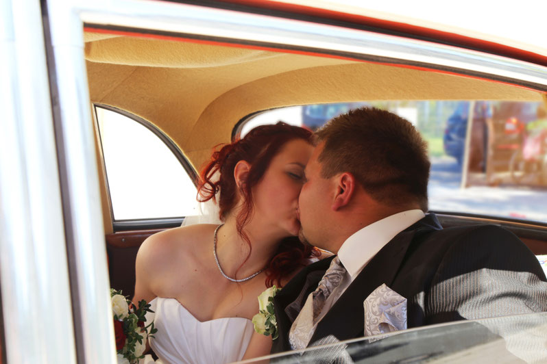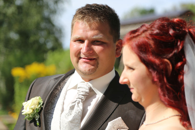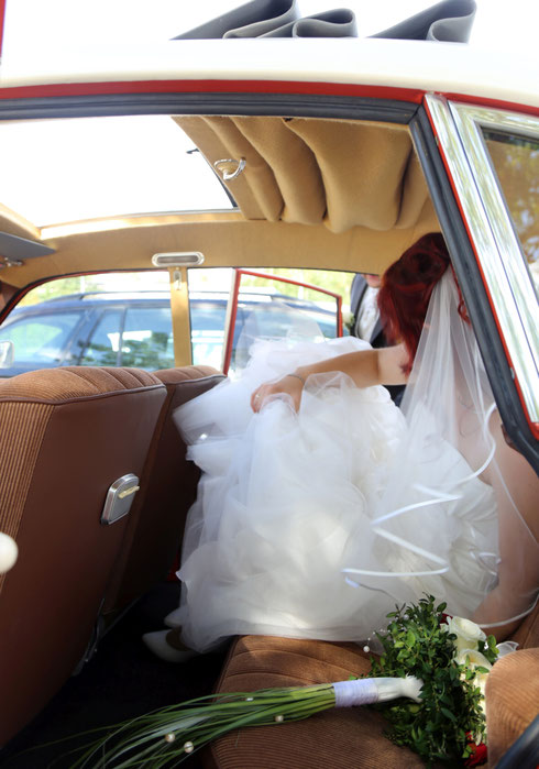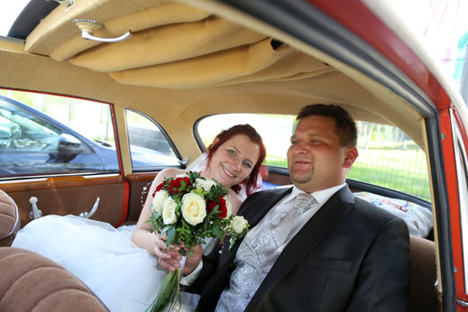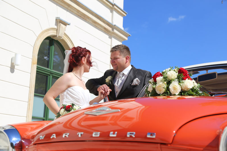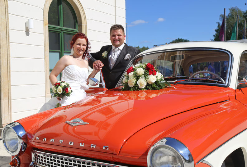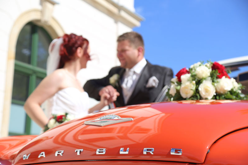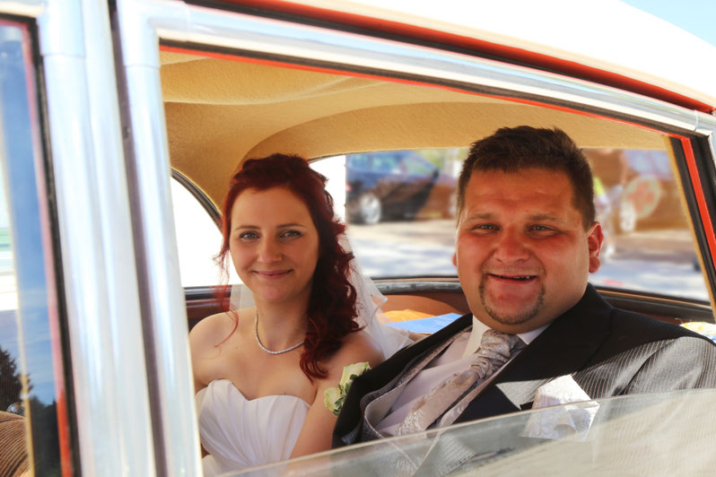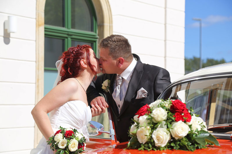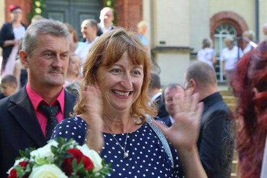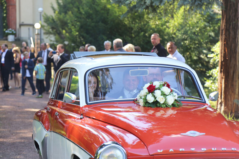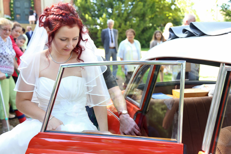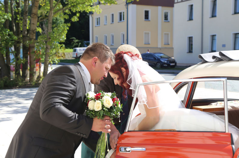 Am 13.08.2022 wartete ich pünktlich 14:30 Uhr vor der Marienkirche in Gersdorf auf mein Brautpaar. Das Wetter war einfach perfekt: die Sonne strahlte bis über beide Ohren, die Vögel zwitscherten am blauen Himmel und dann kam auch schon das Brautpaar mit dem bisher wohl coolsten Brautauto vorgefahren - einem Wartburg in edlem rot/weiß - sehr schick.