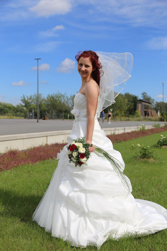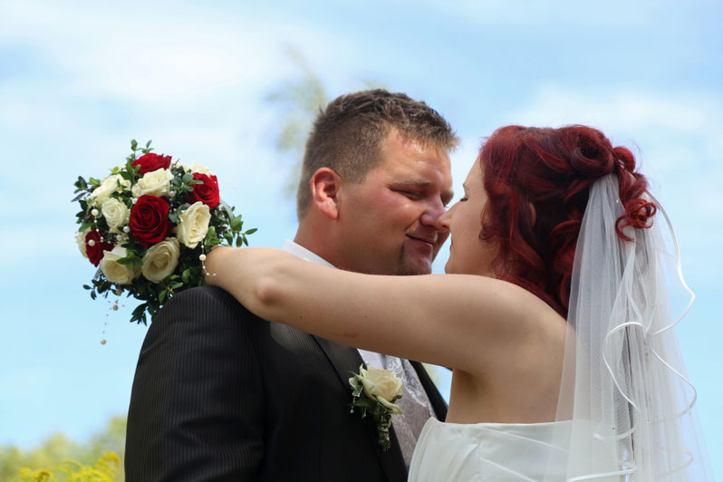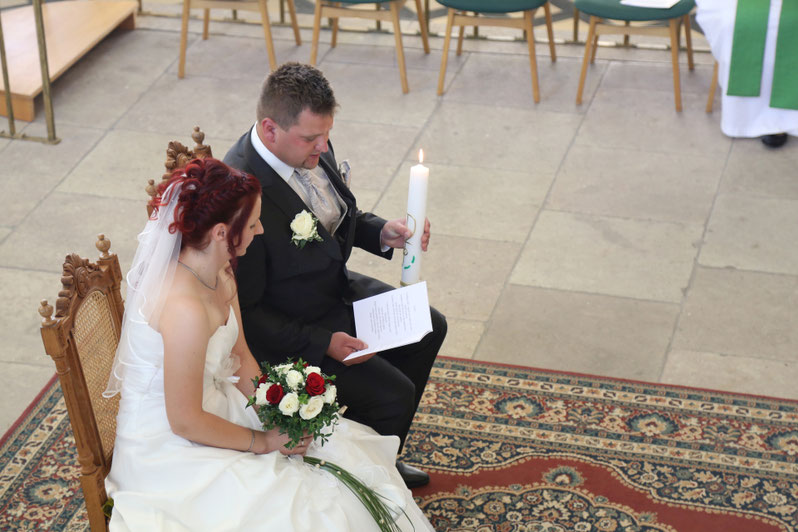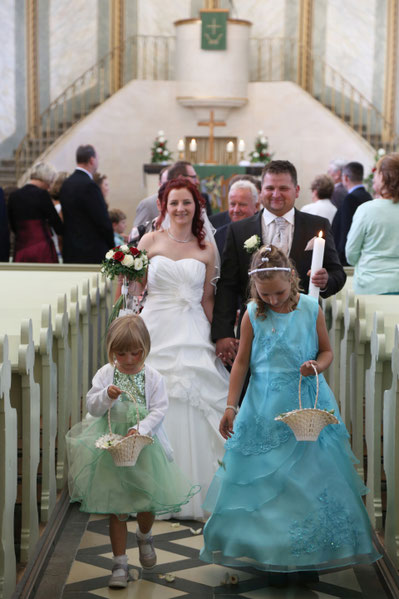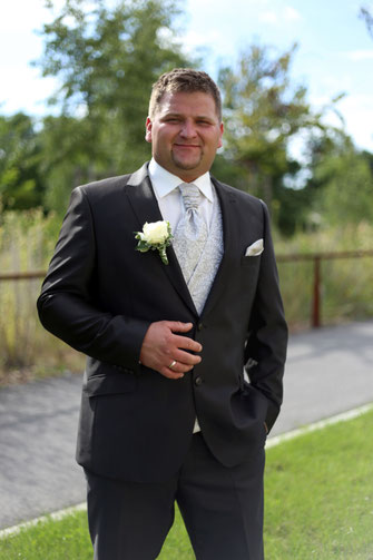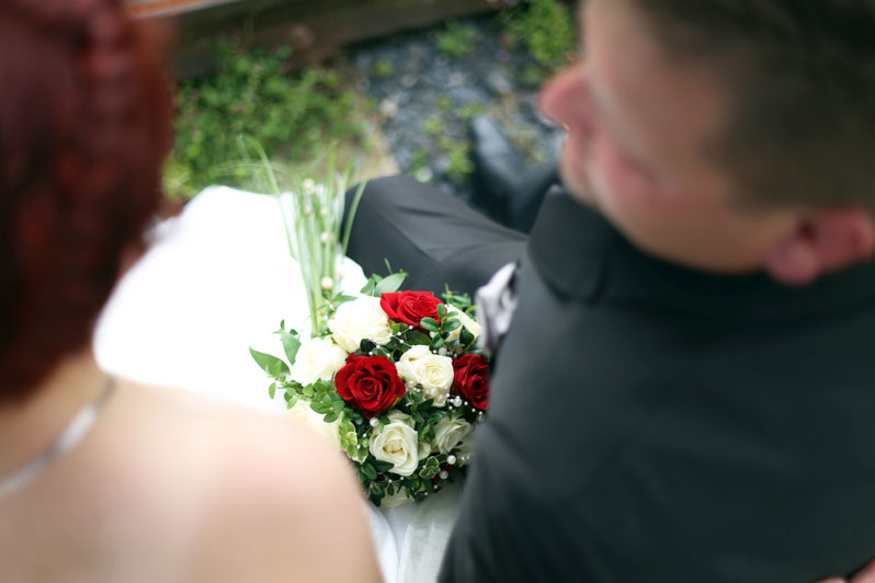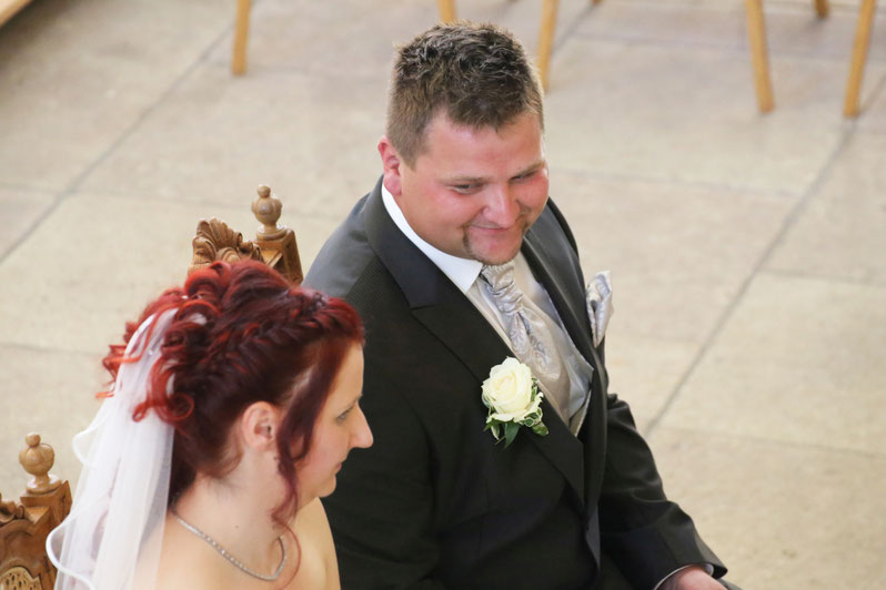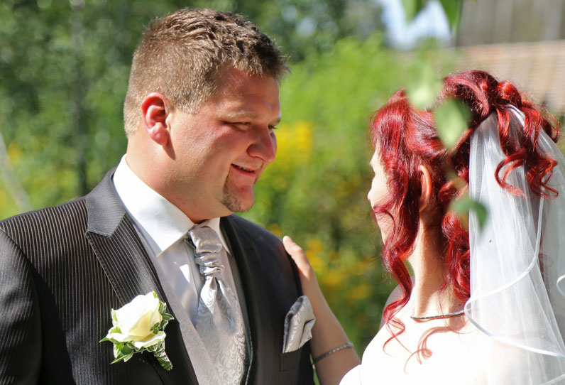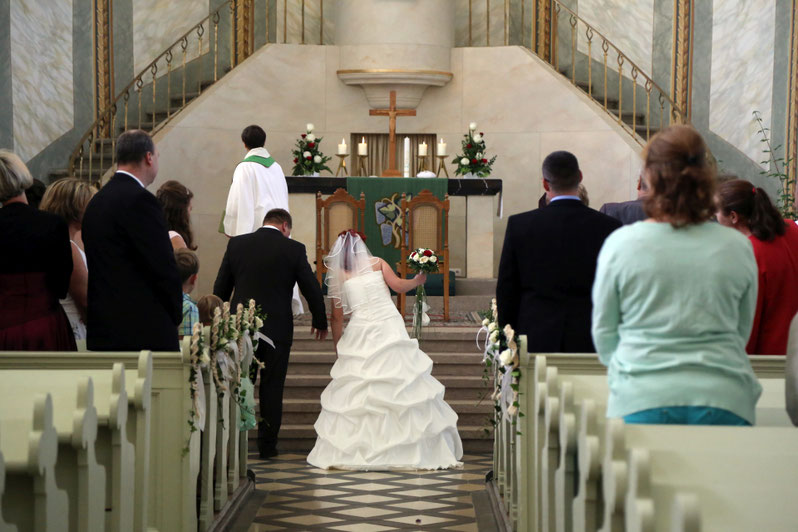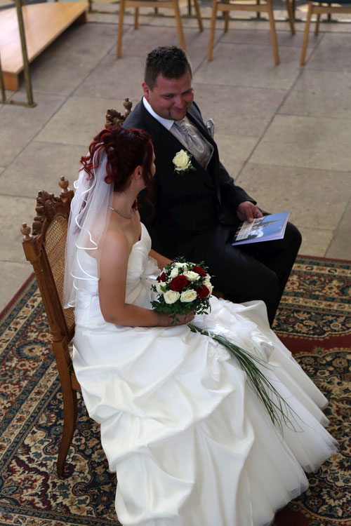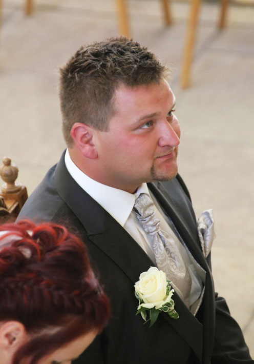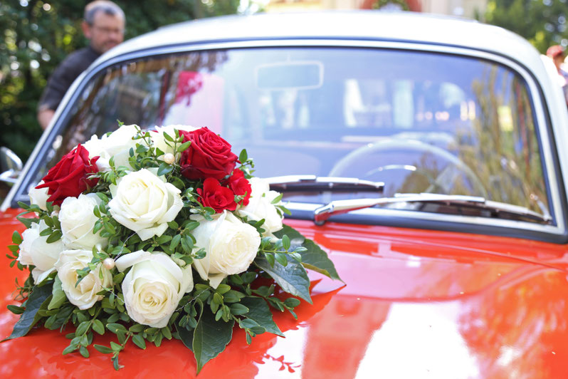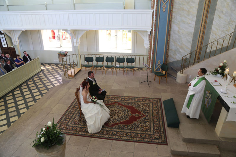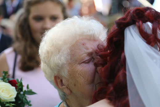 Am 13.08.2022 wartete ich pünktlich 14:30 Uhr vor der Marienkirche in Gersdorf auf mein Brautpaar. Das Wetter war einfach perfekt: die Sonne strahlte bis über beide Ohren, die Vögel zwitscherten am blauen Himmel und dann kam auch schon das Brautpaar mit dem bisher wohl coolsten Brautauto vorgefahren - einem Wartburg in edlem rot/weiß - sehr schick.